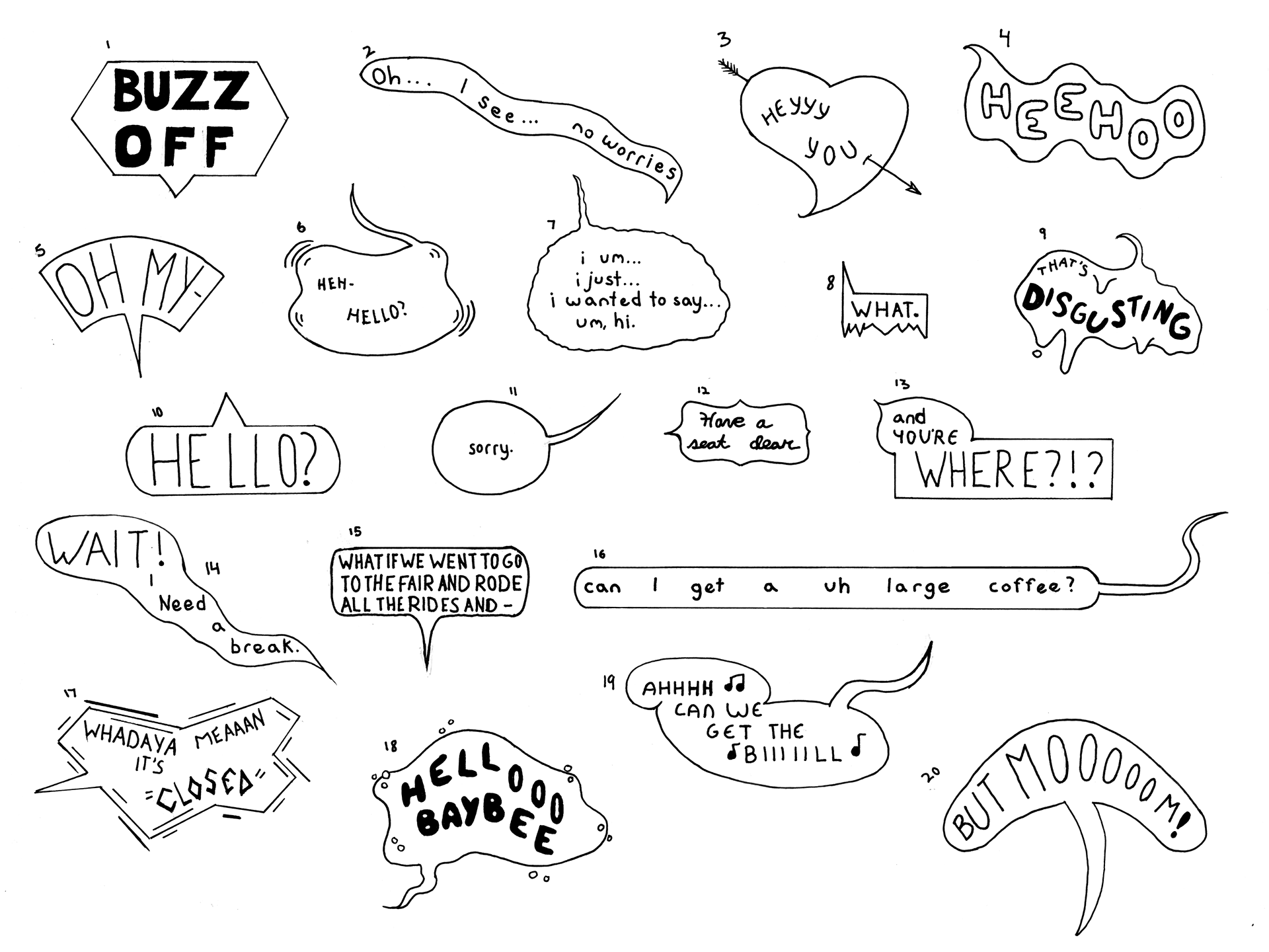 Exercises include creating and applying an alphabet design, speech bubble design, and expressive word and bubble design.