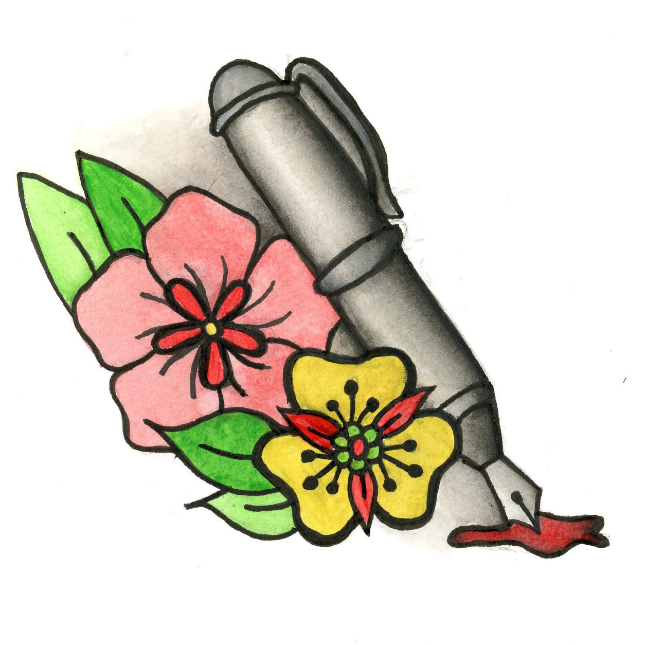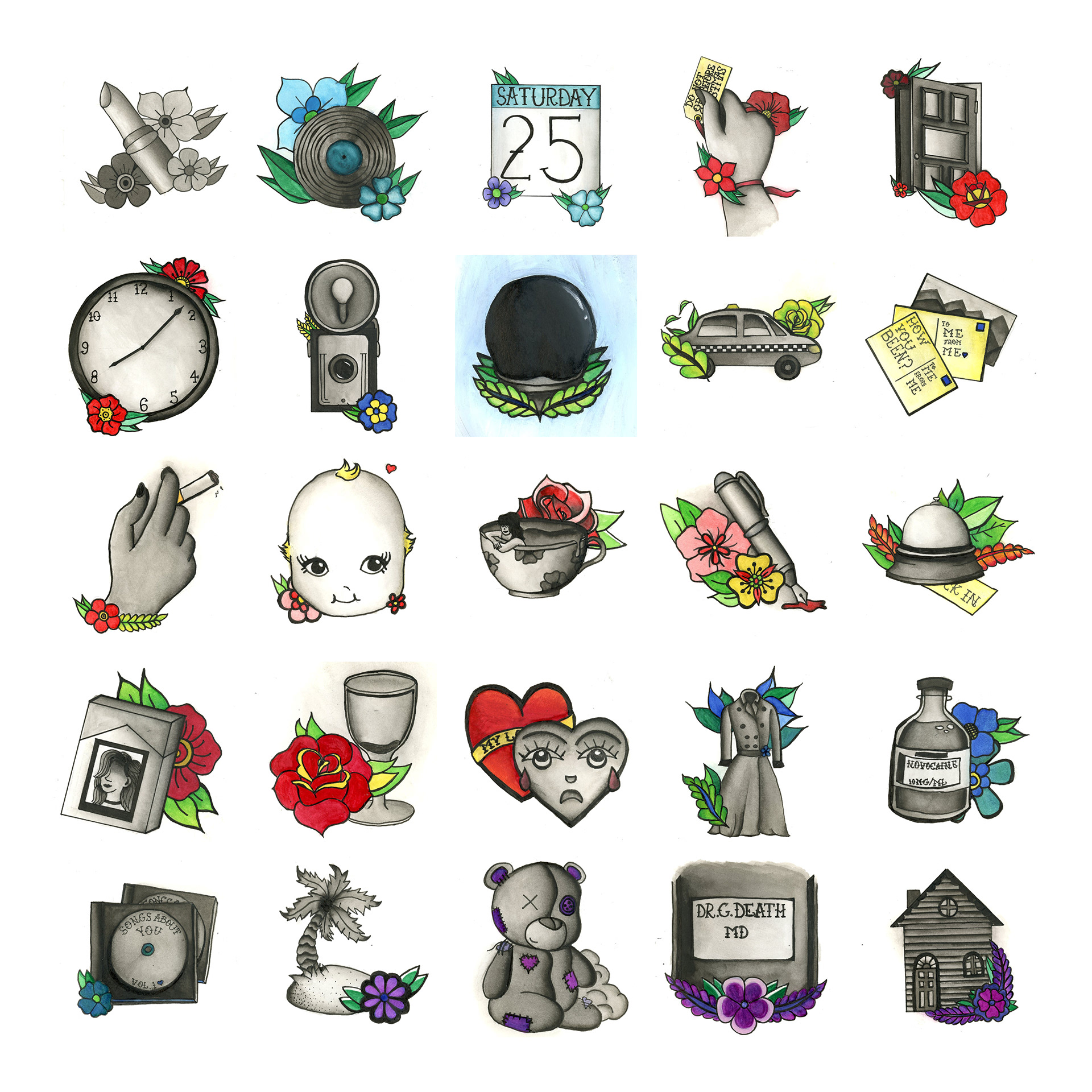 This one-a-day project allowed me to learn and explore the American Traditional tattoo style with watercolor and ink. All 25 pieces are inspired by rock band Fall Out Boy’s discography.
